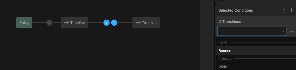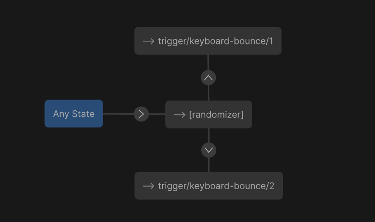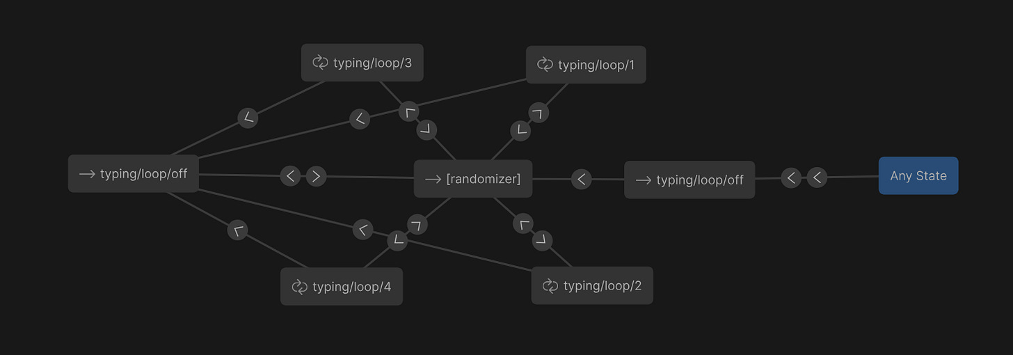 This allows Rive’s randomization to go into the same timeline again. Otherwise, when deciding a transition it wouldn’t include the active timeline as an option. The blank “[stop]” timeline is optional because of this.