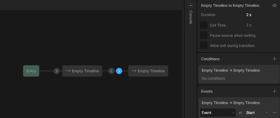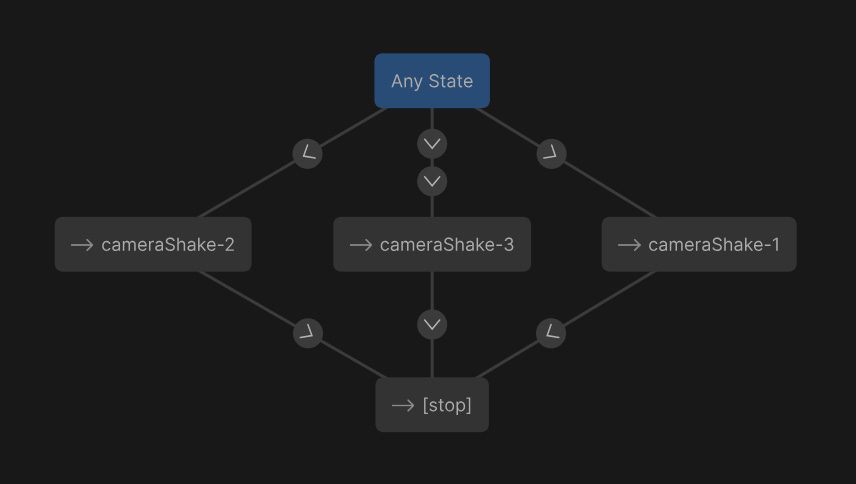 (Optional): Create multiple conditions and inputs for ‘subtle’ and ‘large’ camera shakes that only transition into the related timelines. That is what the second transition going into “cameraShake-3” is for.